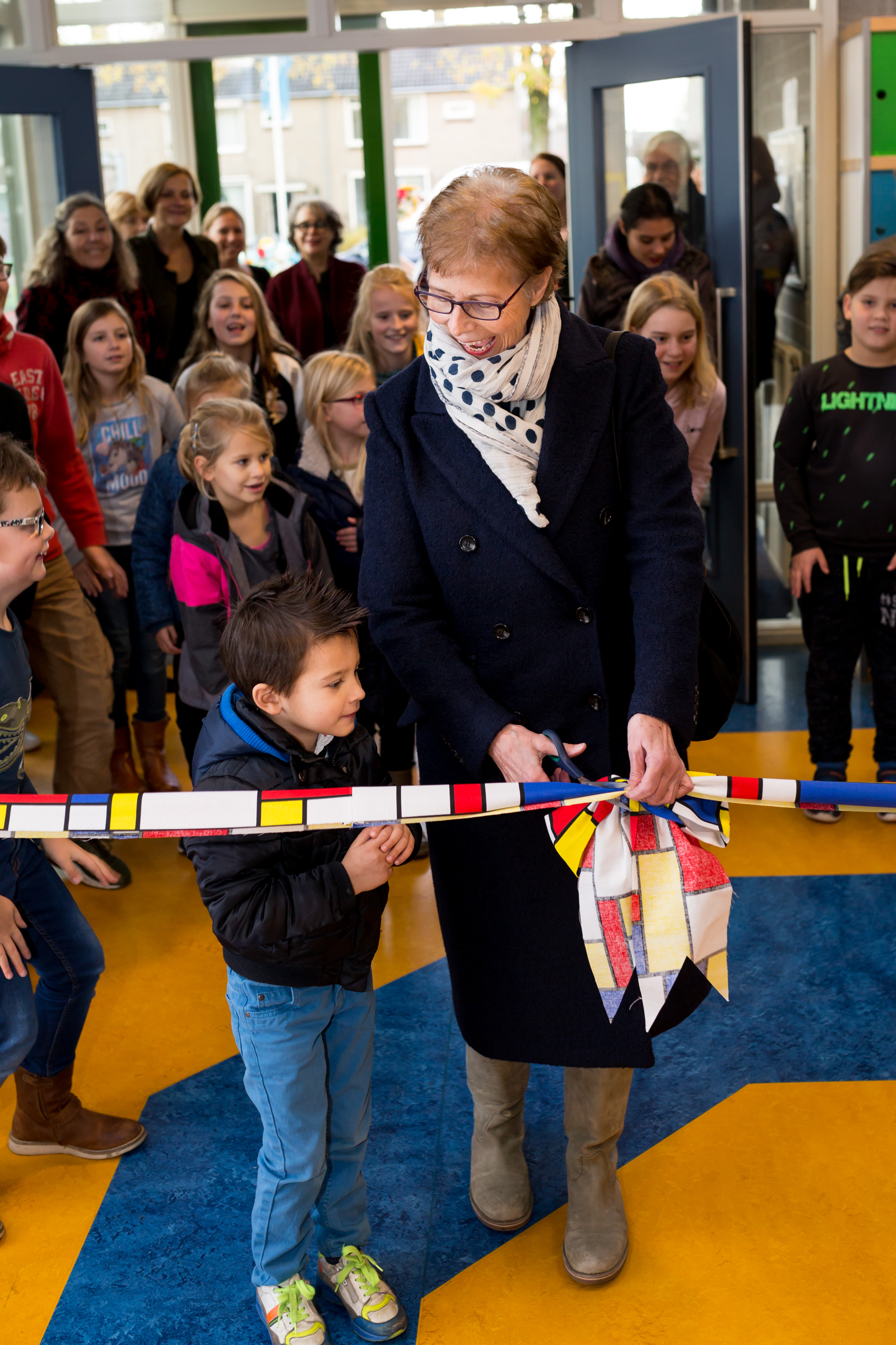 Verwelkomd door de kinderen en haar collega’s knipte zij het lint door waarmee de expositie “De Stijl” officieel geopend werd. De kinderen lieten haar vol trots zien wat ze gemaakt hebben.